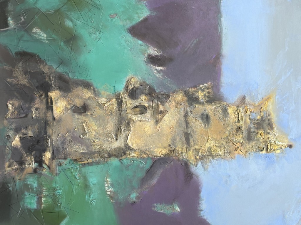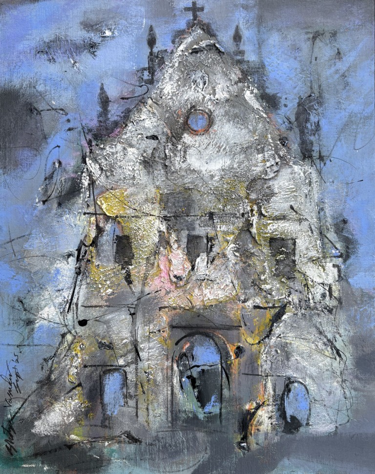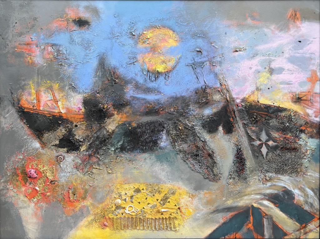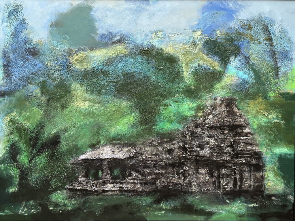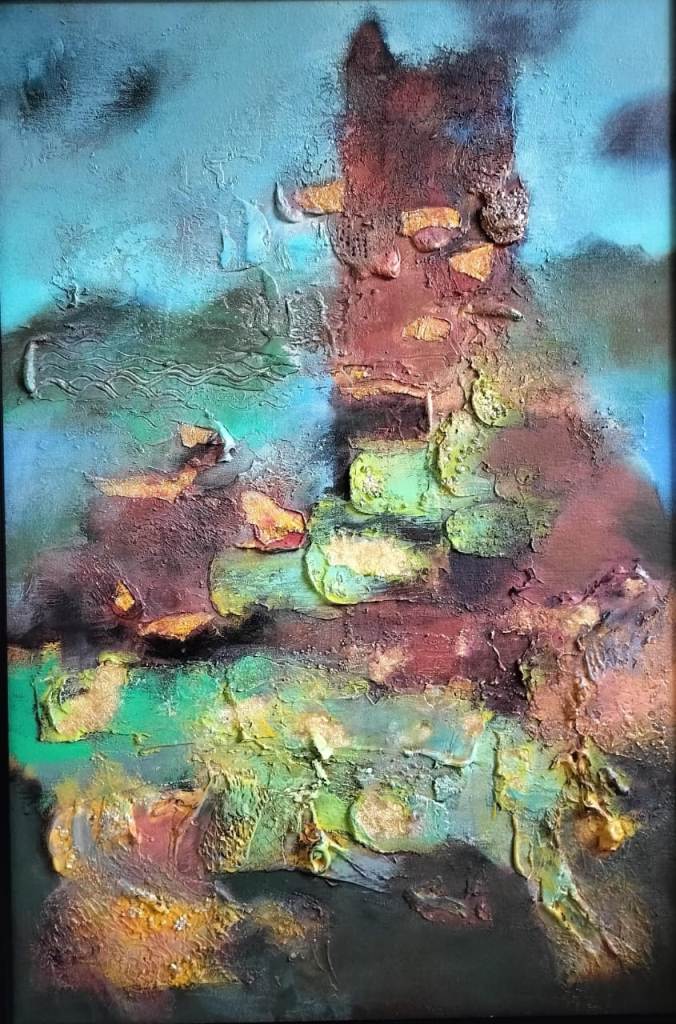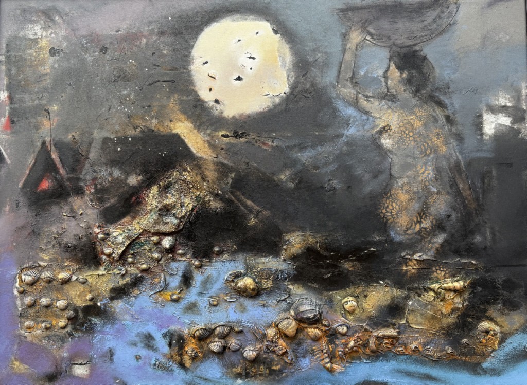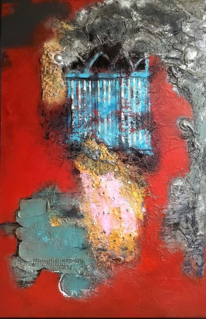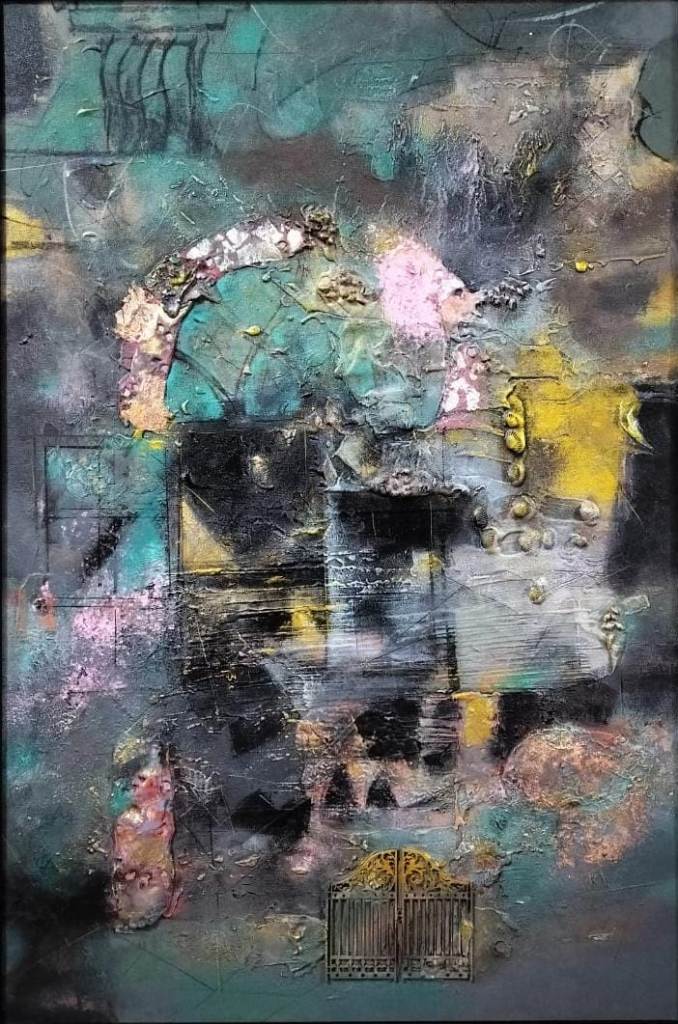 Across his body of work, Shetye attempts to paint a world that extends beyond the physical one—a space where the inner and outer realms intertwine. God-made nature and man-made structures, two forces that shape human existence, have left deep impressions on him. Their contrasts, their harmonies, and their silent dialogues become visible through his paintings. Layered compositions blur foreground with background, history with memory, and the tangible with the dreamlike, much like Goa’s own overlapping stories. His use of mixed media—textures, fabrics, metals, and found objects—adds physical depth and symbolic nuance, creating canvases that feel alive and multidimensional.