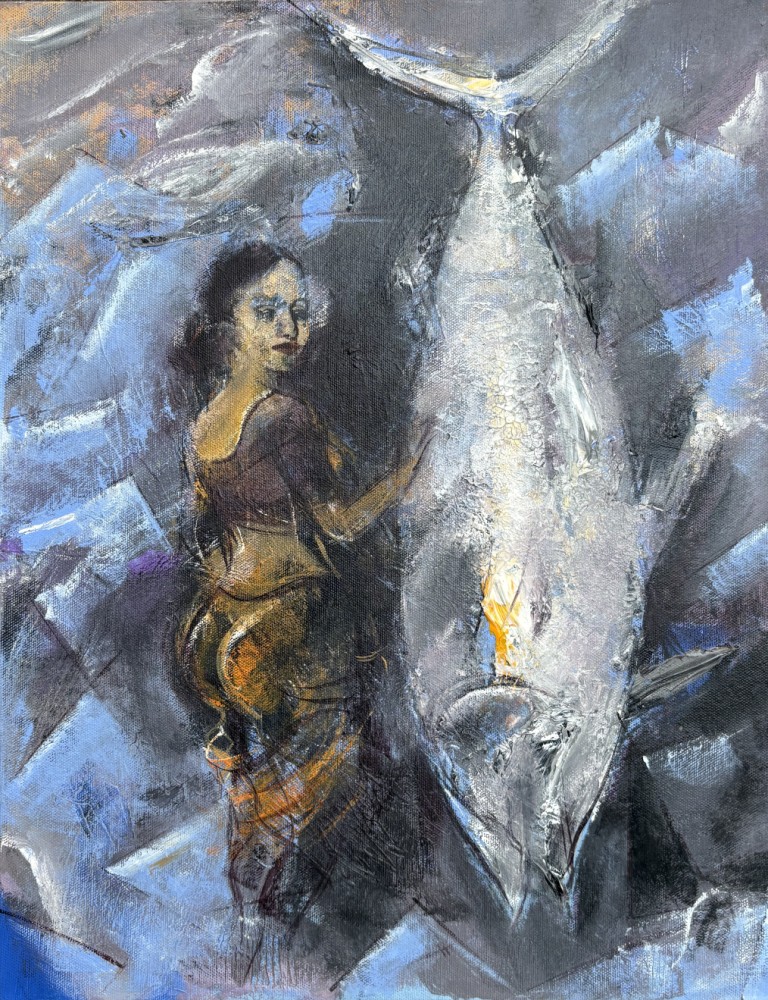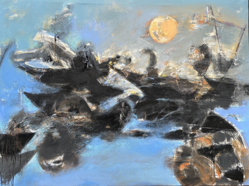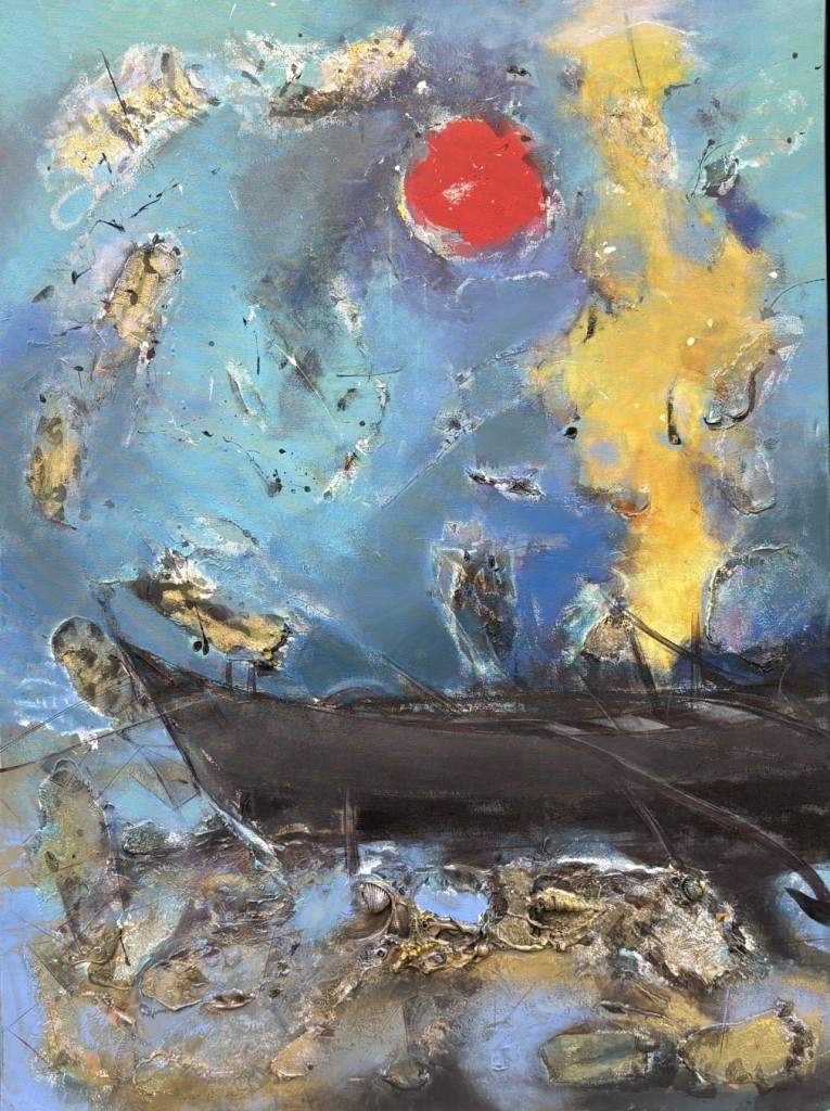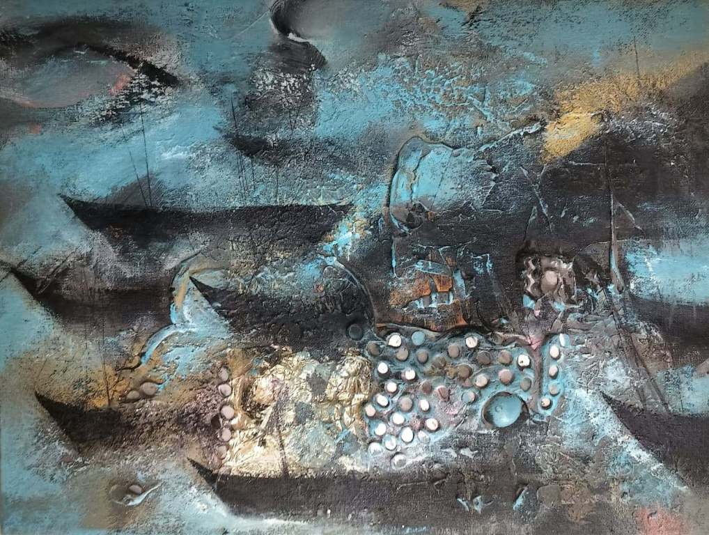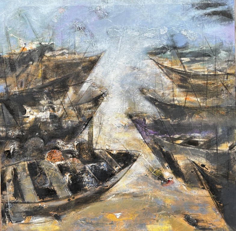 The exhibition immerses viewers in Goan life: the salty air heavy with feeling, the play of warm sunsets over the Arabian Sea, floating boats drifting across deep waters, and delicately adorned monuments watched over by angels symbolising purity and innocence. Colours flow like tides, shifting with spontaneity, mirroring both the sea’s temperament and the artist’s improvisational process.